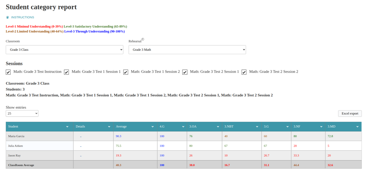 - Instead of seeing a simple result of how much a student scored in a test, the teacher will see a row of category-driven data depicting how much each student scored in that quiz for each of the categories.