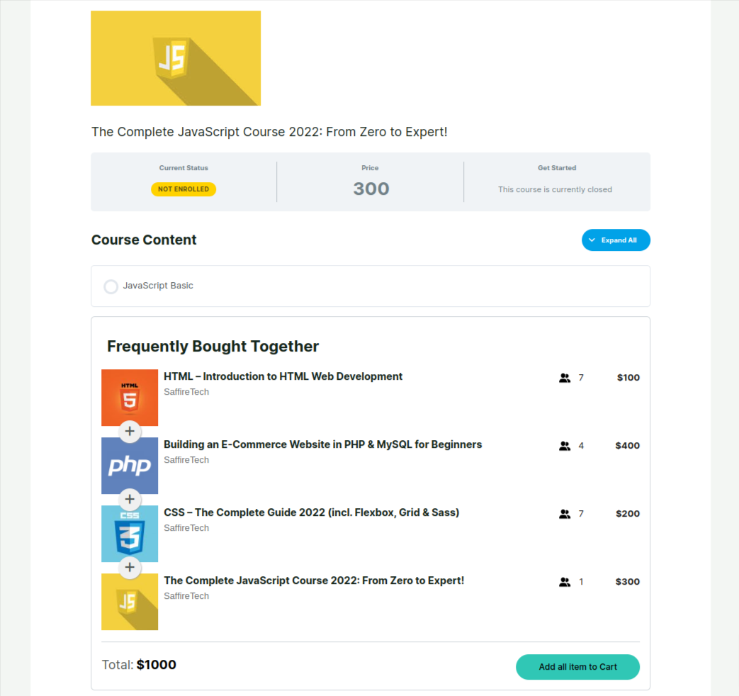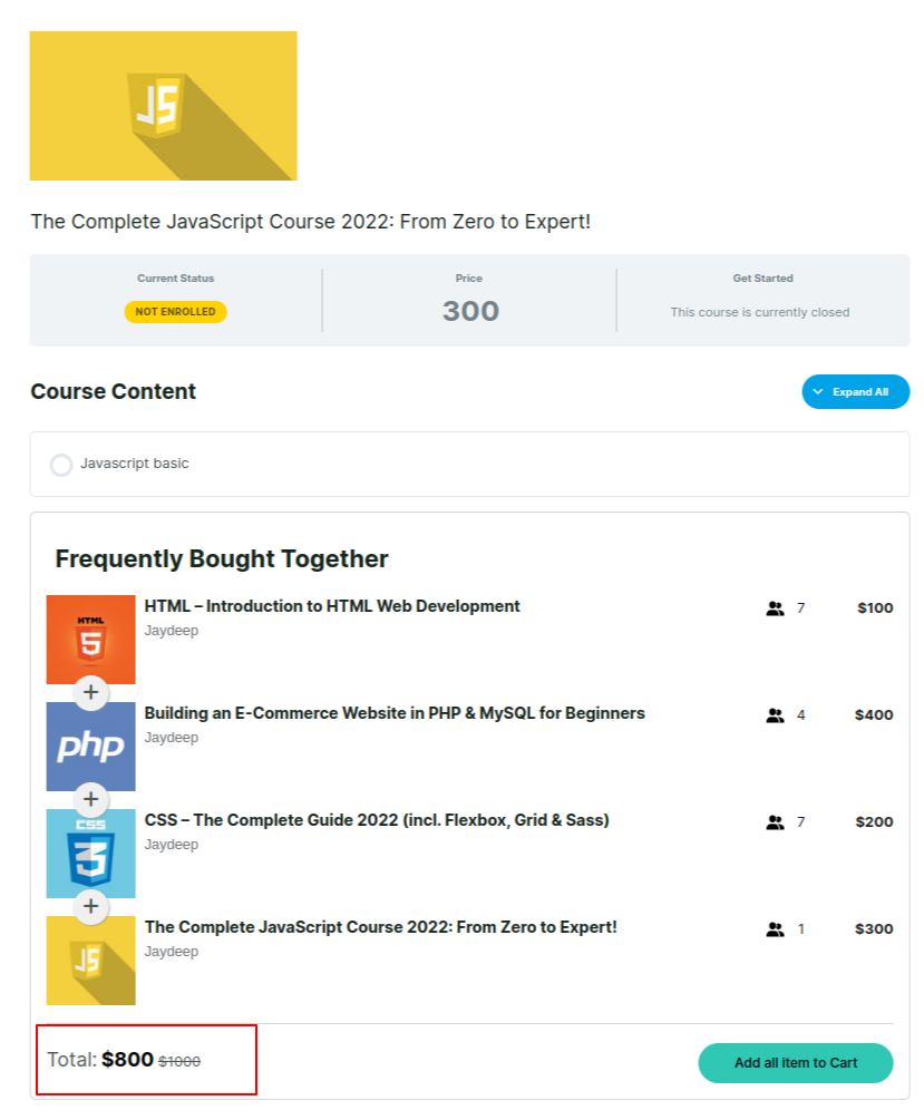 - Purchase All Courses from FBT Bundle: Customers must add and keep all the courses from the Frequently Bought Together (FBT) bundle in their cart to qualify for the discount. If they remove any single course from the cart, the discount will not apply