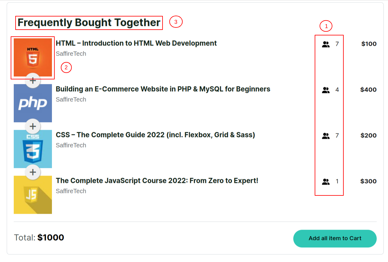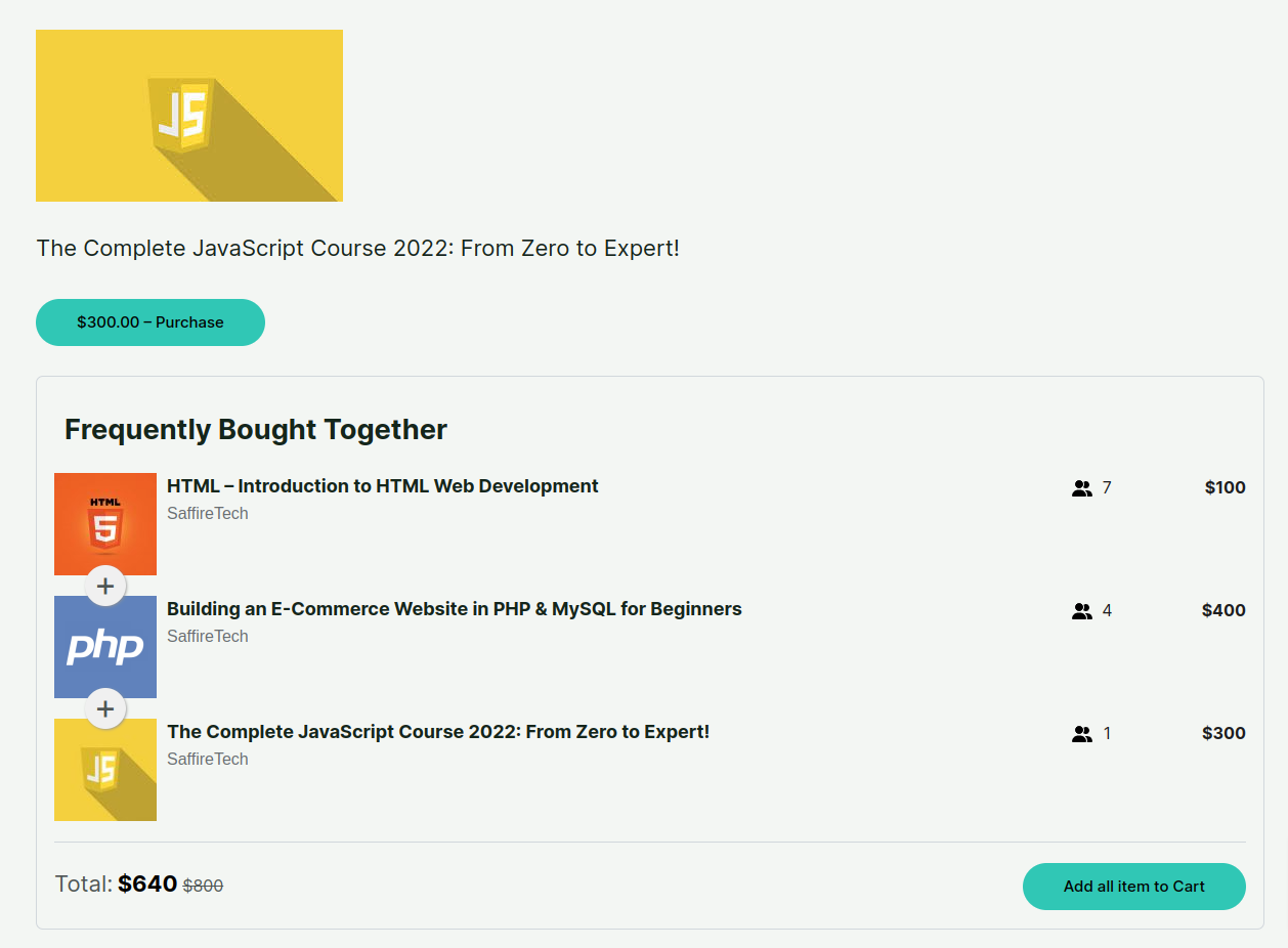 1) Display enroll count for the course: Shows a count of users (who enrolled for that course) next to each course in the Frequently Bought Together widget.