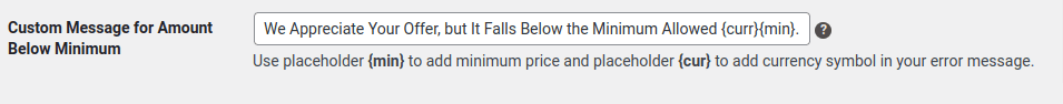 These placeholders dynamically replace with the actual currency symbol and price limits associated with the specific product.
