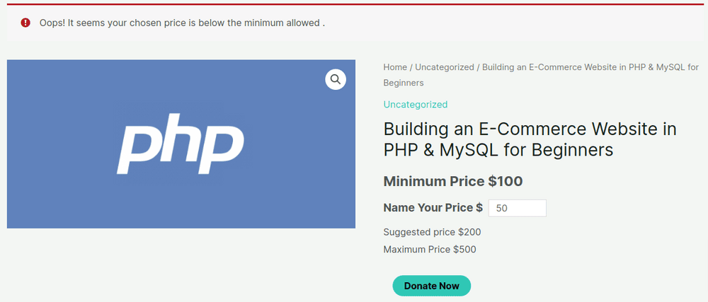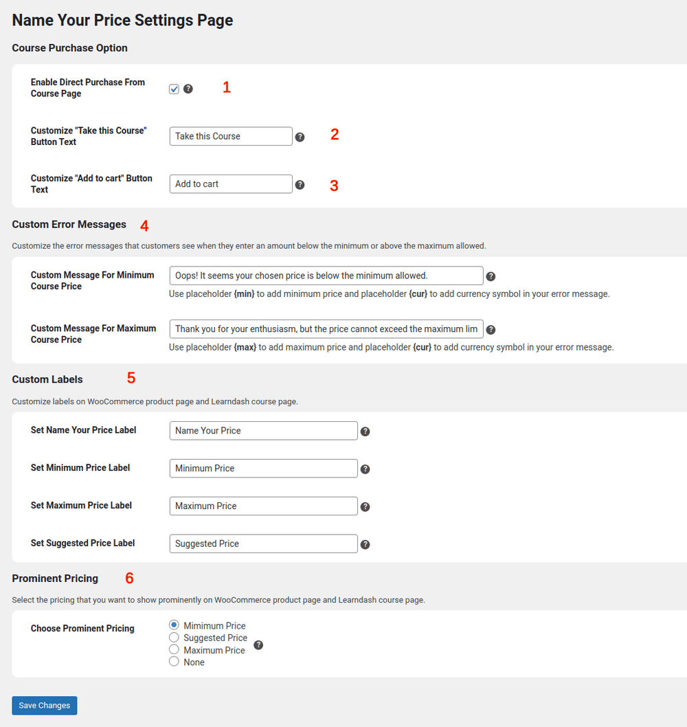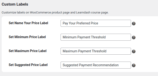 This setting empowers you to tailor the labels associated with “Name Your Price” elements, which are displayed on both WooCommerce product pages and LearnDash course pages. You have the creative freedom to choose and assign names to these labels that resonate with your requirements.