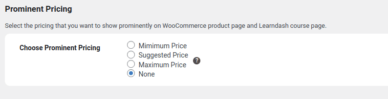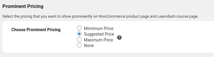 This settings give you the flexibility to choose what pricing information is to be shown prominently on the WooCommerce product page and/or LearnDash course page, emphasizing what’s most important to your customers. You have the option to choose from minimum price, maximum price , suggested price also you can skip to highlight any price by selecting none.