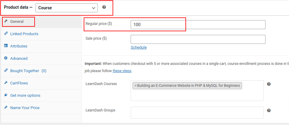 3. Now in the Product data meta box select product type as Course and under the General tab remember to set a Regular price to the course product.