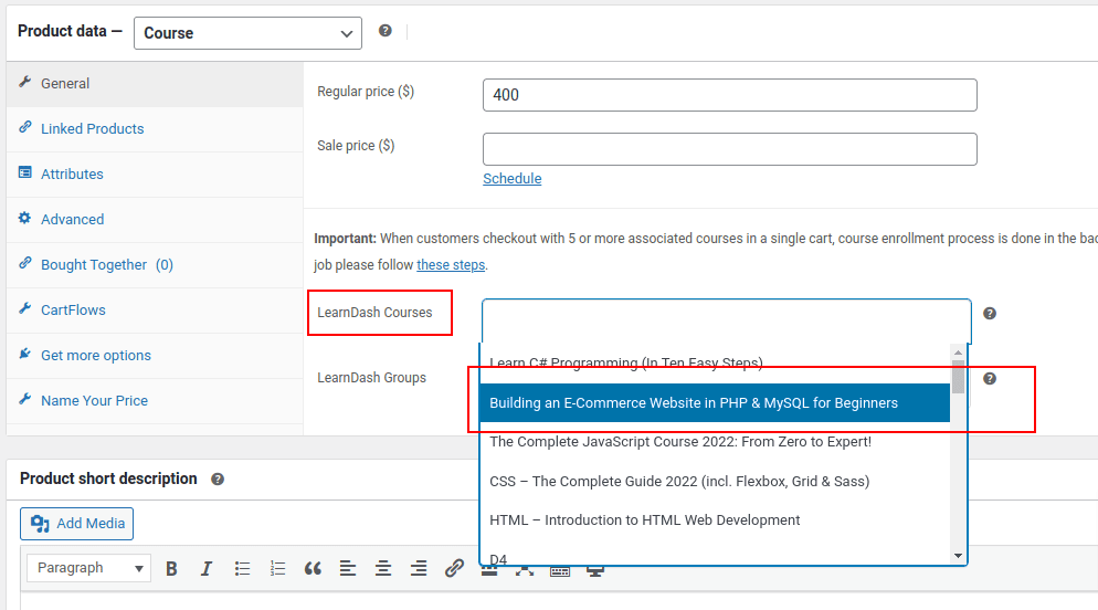 4. Now in LearnDash Courses multi-select box select the name of the course you created in the previous step to link it with the current product and update that product.