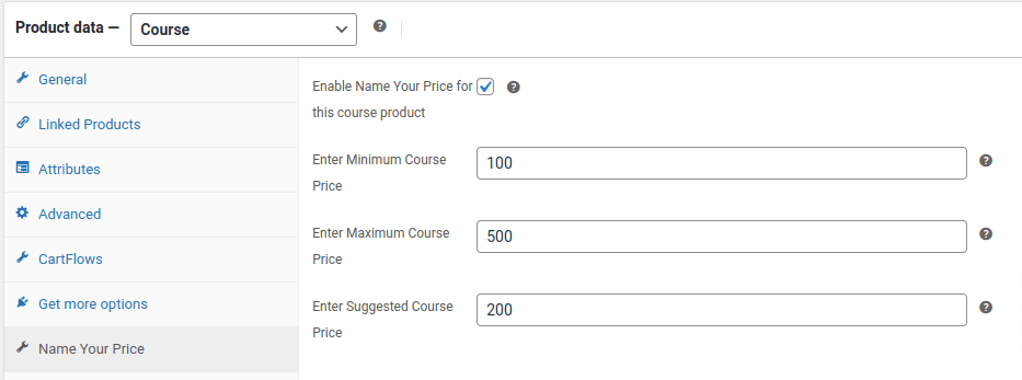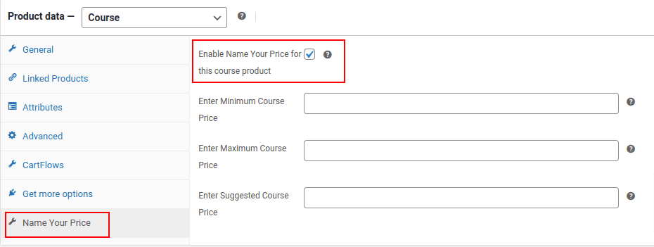 2.  Check the checkbox labelled “ Enable Name Your Price for this course product”