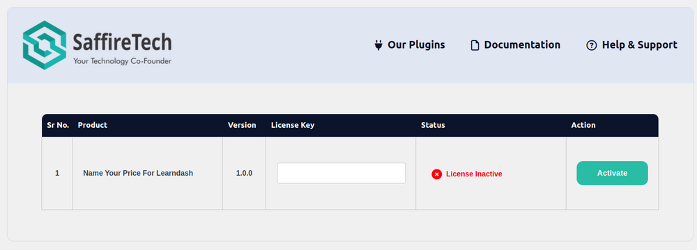 1. In the admin area navigate to SaffireTech License menu and you will get the SaffireTech License Page.