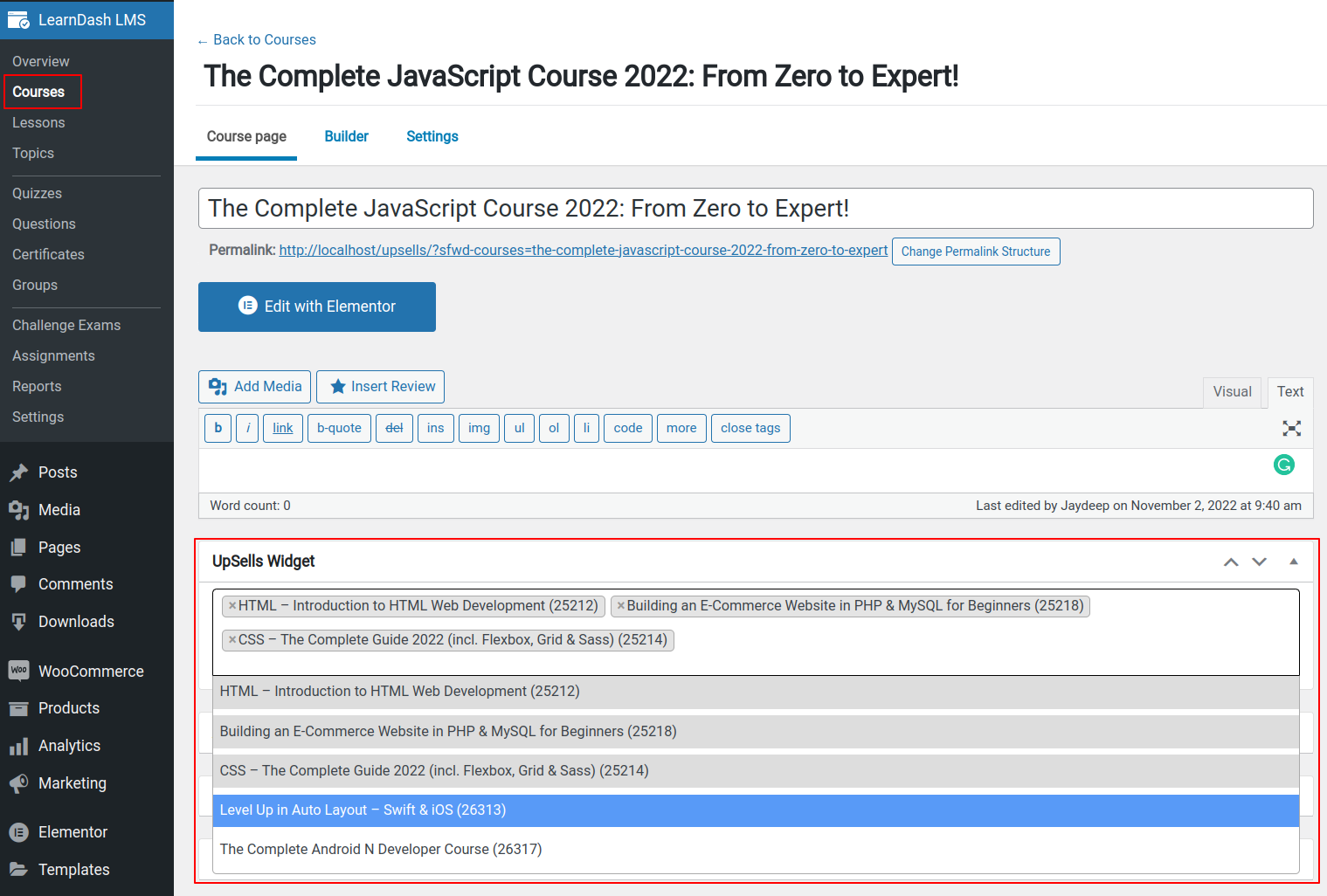 - Click inside the metabox and select the list of courses you want to display as upsells with the current course.