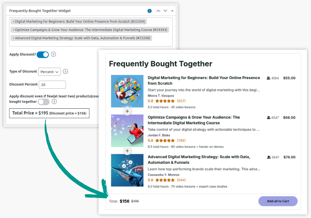 One of the most powerful features of the ‘Frequently Bought Together for LearnDash’ plugin is its ability to offer discounted course bundles. If you’re promoting a group of related courses, you can use the plugin to showcase these courses as a bundle and incentivize purchases by offering a discount when bought together.