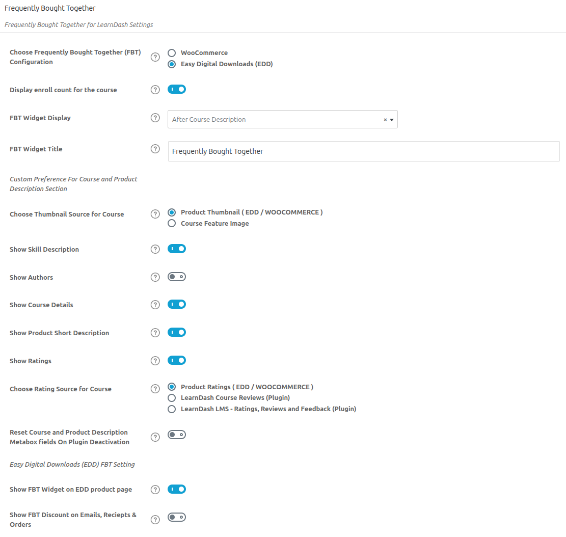 You have options to display the FBT widget either below the course description or anywhere on the LearnDash course page using a shortcode. This gives you full control over widget placement.