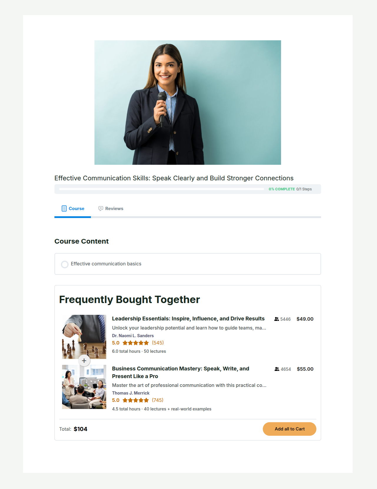 For example, if you have a beginner, intermediate, and advanced course on the same topic, displaying them as a bundle encourages students to invest in their entire learning journey at once. The discount acts as a compelling reason for students to purchase more than one course, ultimately increasing your average order value and boosting revenue.