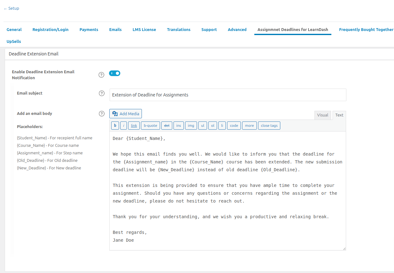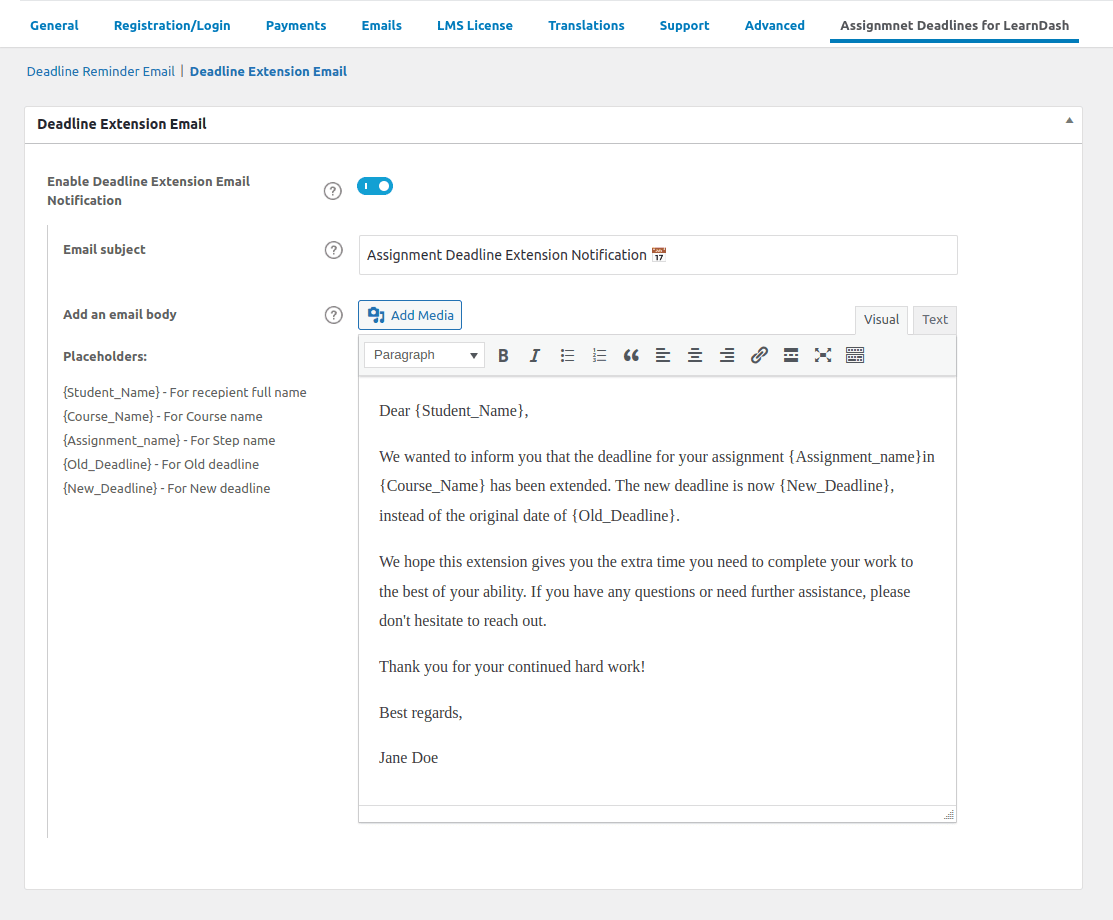 The Assignments Deadline for LearnDash plugin includes a feature to automatically notify students via email about any deadline extensions. These notifications are customizable, allowing you to add your own message or details. This ensures that all students are kept up-to-date with the latest information regarding their assignments.
