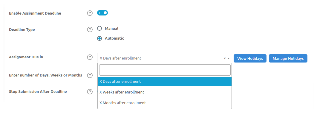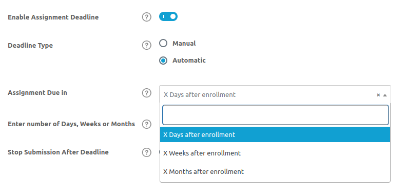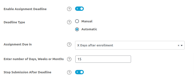 By enabling an automatic deadline the assignment deadline will automatically be adjusted according to the enrollment date of the student into the course. For eg if the deadline is set for 5 days after enrollment date the assignment will due exactly after 5 days of the student enrollment into the course.