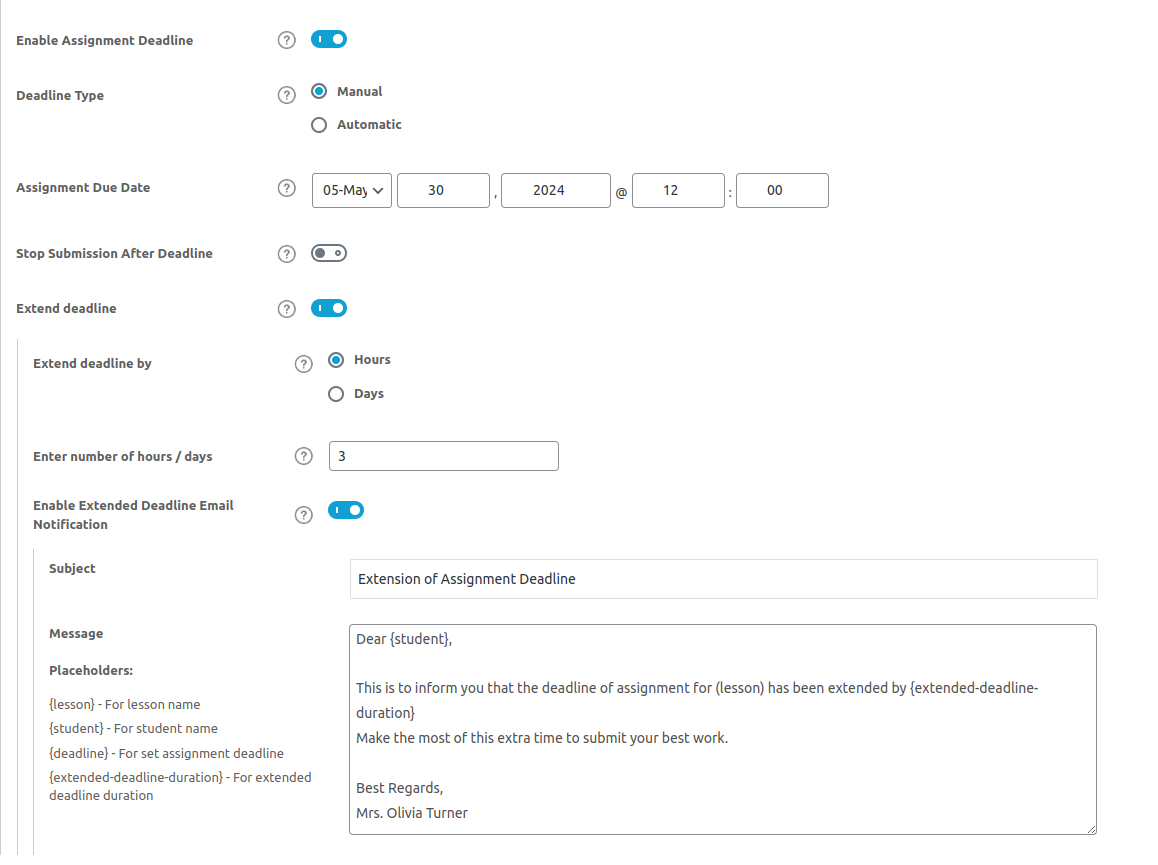 Absolutely! This plugin offers the flexibility to extend Manually added deadlines as needed. If you need to give your students extra time, you can easily adjust the deadline by adding more hours or days. This extension can be done directly from the assignment settings, ensuring that any changes are quick and hassle-free.