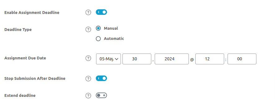 Setting up deadlines is simple with the Assignments Deadline feature in the LearnDash plugin. After installing and activating the plugin, navigate to the ‘Assignment Settings’ under ‘Assignment Uploads’ in your LearnDash course. Here, you can enable the assignment deadline feature. You have two options: select ‘Manual’ to set a uniform deadline for all students, or choose ‘Automatic’ to adjust deadlines dynamically based on each student’s enrollment date.