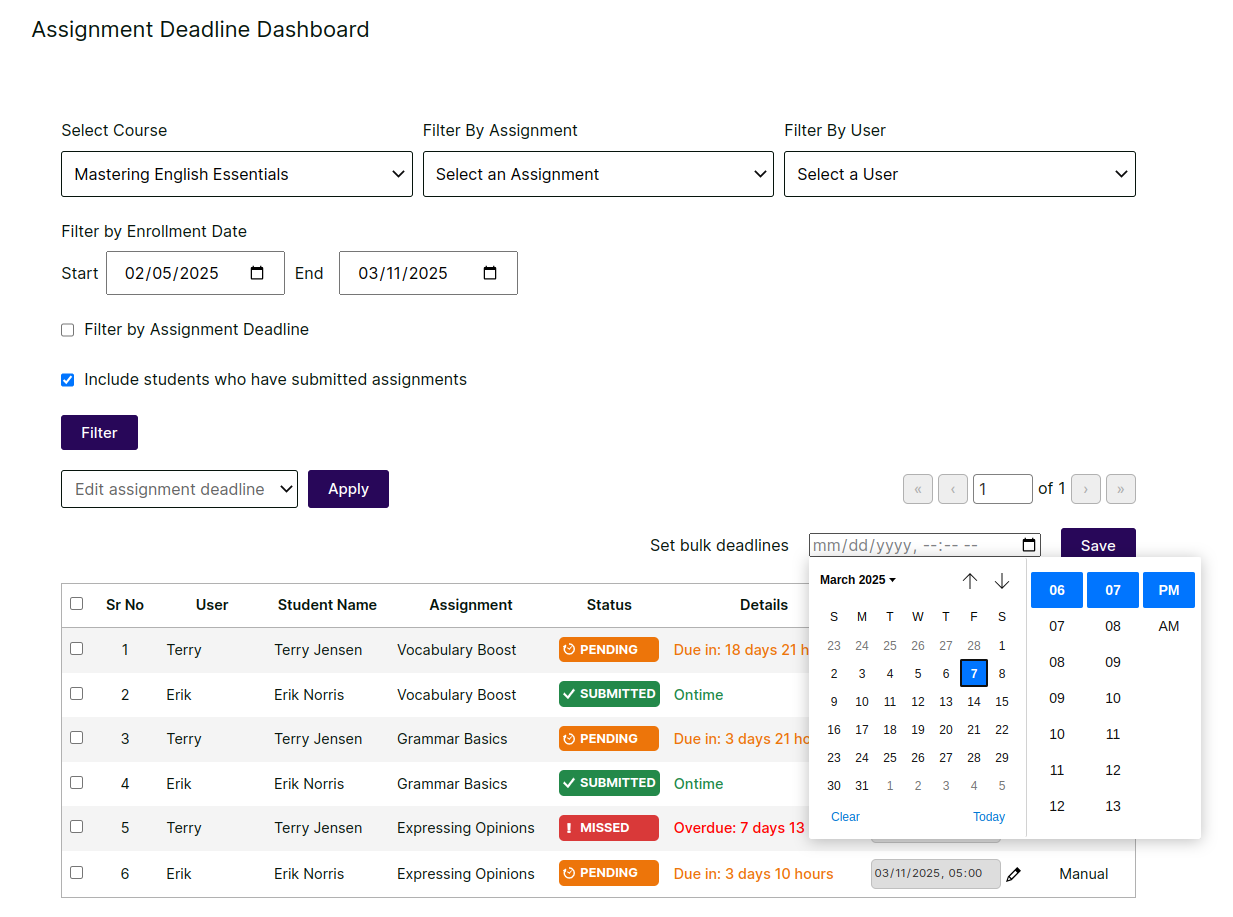 This streamlined LearnDash assignment management saves valuable time, allowing you to quickly update deadlines for multiple students at once, boosting productivity.