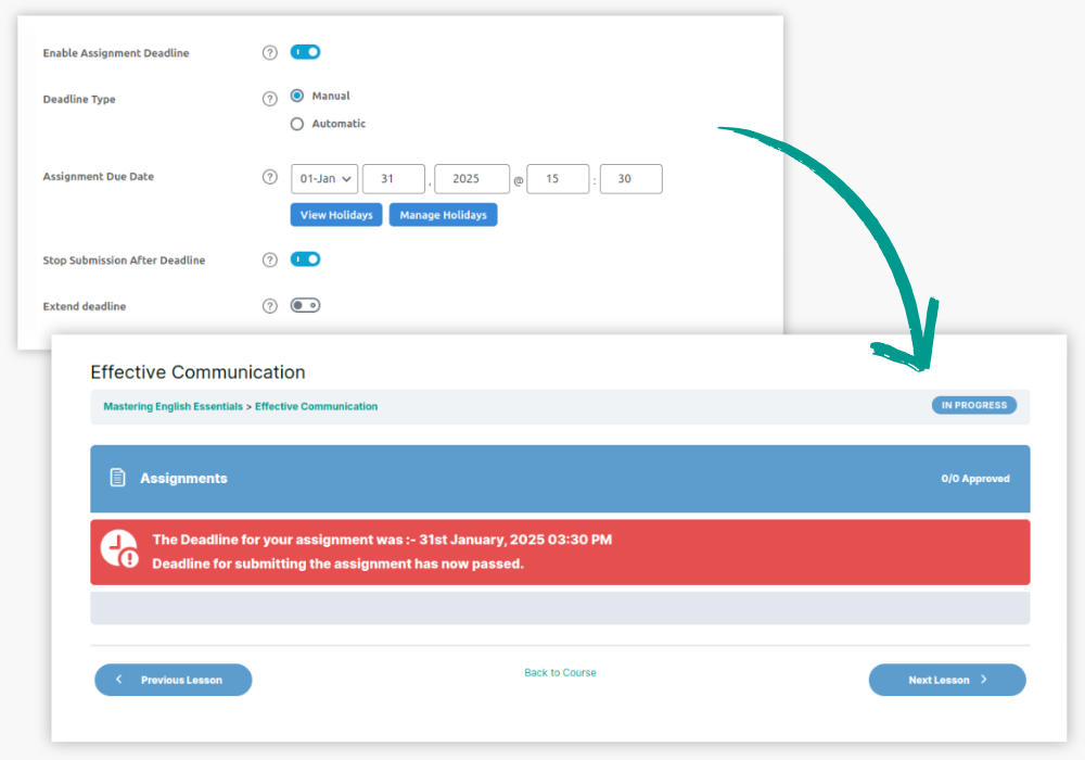 This feature helps maintain course integrity by restricting late submissions, encouraging students to submit on time, and promoting a disciplined learning environment.