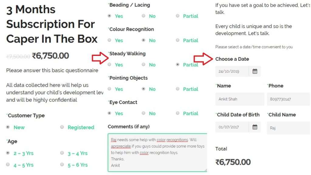 - Unlike normal eCommerce websites where you buy the product and do a quick checkout, this site required customers. i.e. parents/guardians of kids who wish to buy the activity kits to answer certain questions before ordering. The questions will ask parents to provide information on their children in regards to understanding how developed the child is in regards to reading, writing, identifying colors, etc. Based on the answers provided, the child specialists at Caper will shortlist a set of toys that will help the learning for the child.