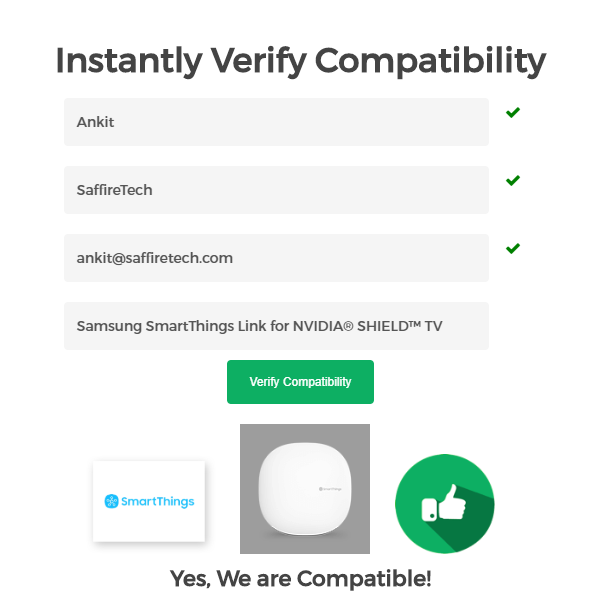 - Once the user inputs these and clicks on submit, the user is shown the results. If the device exists in the database, the user will be shown the result as: “Yes, We are Compatible” message with a Thumbs Up Icon, Device Image & Brand Image else a Thumbs Down image with a message ” Sorry, We aren’t compatible Yet”. Every time a result is displayed an AJAX request is sent such that each entry is captured and inserted into the database.